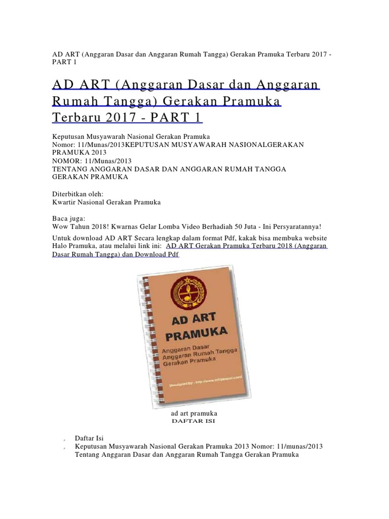 - Jika kakak mencari AD ART Gerakan Pramuka Terbaru Hasil Munas X Tahun 2018 Silahkan buka link ini. ADART merupakan Pengikat persatuan dan kesatuan Gerakan Pramuka dalam prinsip idealisme tindaklaku baik organisatoris sosial maupun budaya. UU RI Nomor 12 Tahun 2010 tetang Gerakan Pramuka dan berstatus badan hukum.